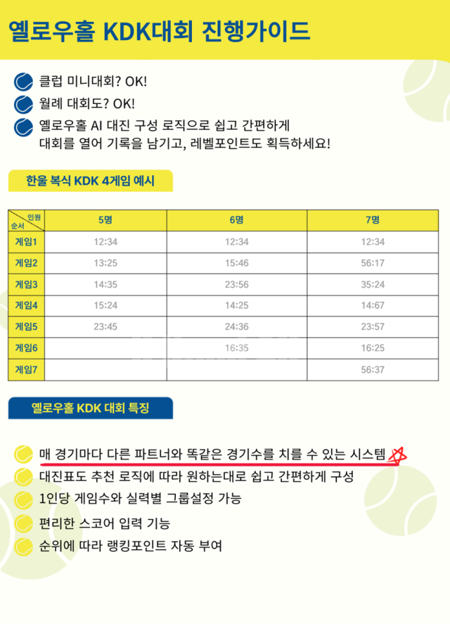 [KDK 경기방식]은 기존의 고정파트너 형식의 단점을 개선하기 위해 매 게임 파트너를 바꾸면서 경기하는 경기방식으로,